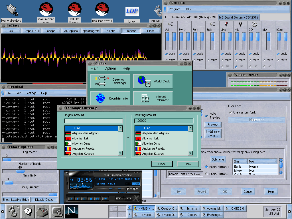 Globex - Running on Linux through Wine!Globex runs on Linux, thanks to WINE!WINE is an open-source complete implementation of the Windows API. You can download WINE from the project's web site. The March 26, 2000 version of WINE was used to run Globex and take these screen shots. First, a screen shot of Globex running on a MS Windows XP Pro desktop![]() Globex running on a Linux Gnome desktop![]() Globex running on a Linux KDE desktop![]() |